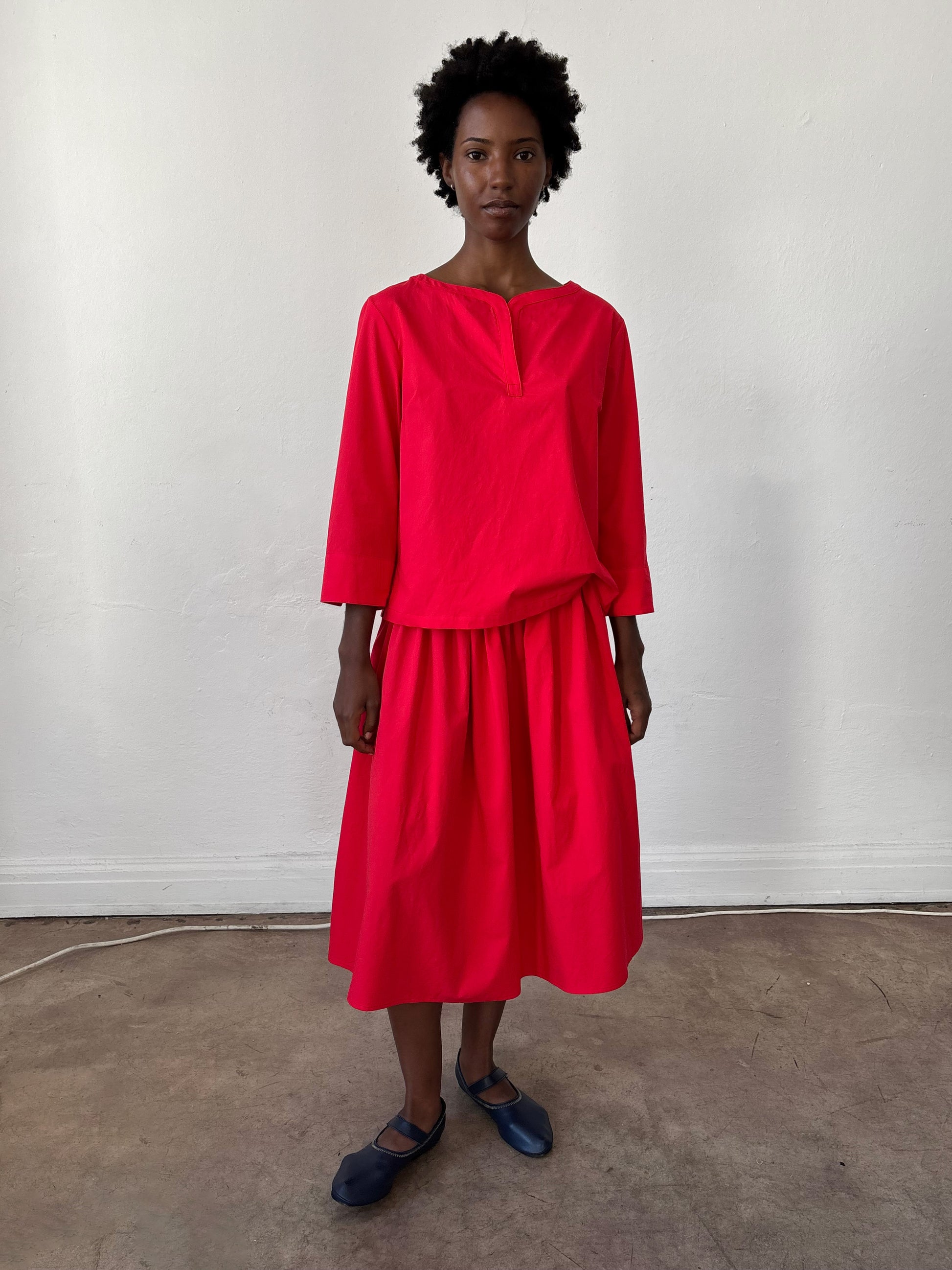 100% Cotton blouse with a boat neck, placket neckline, and slit sleeve detailing. Designed, cut and sewn in Echo Park, Los Angeles.