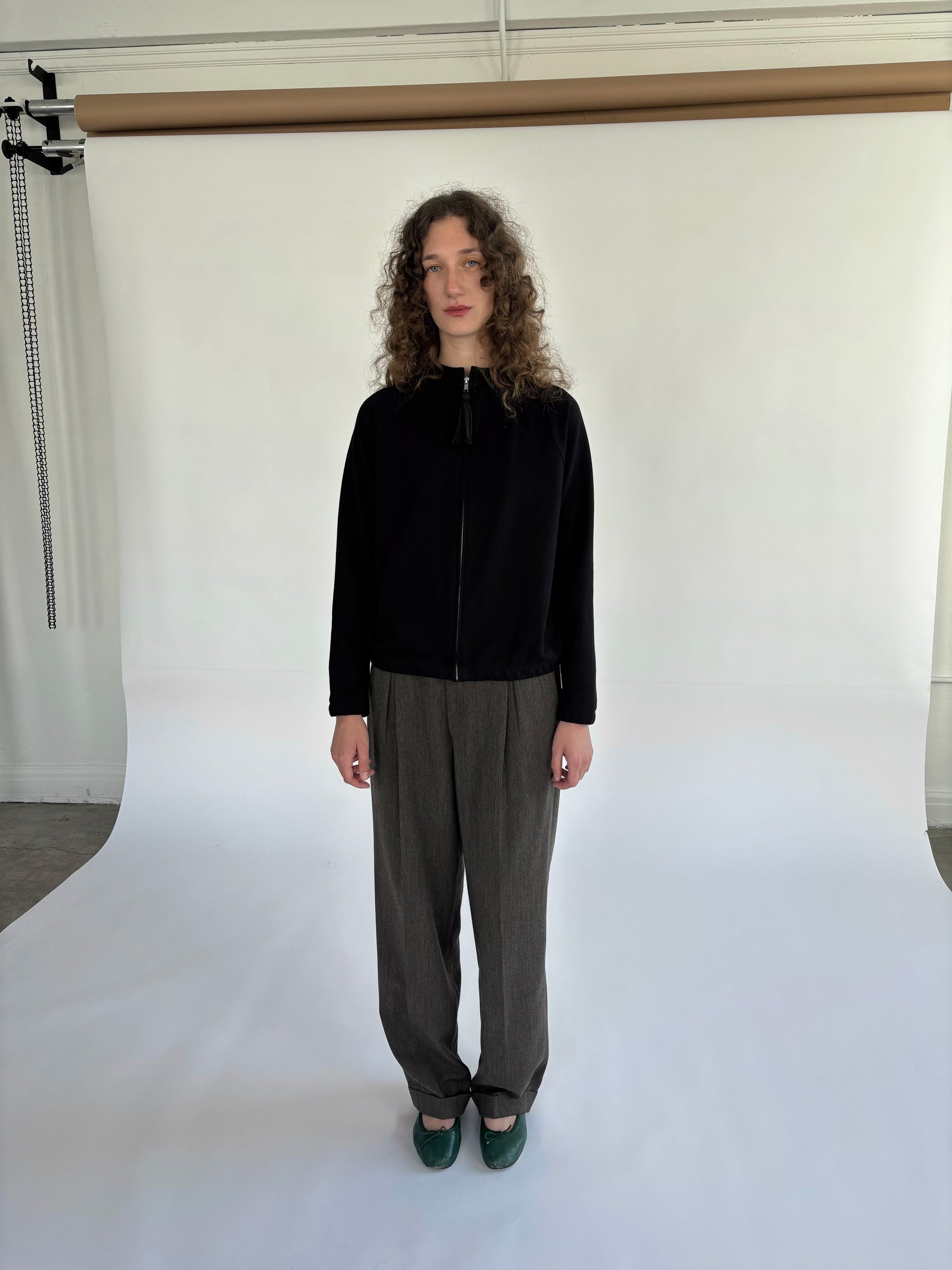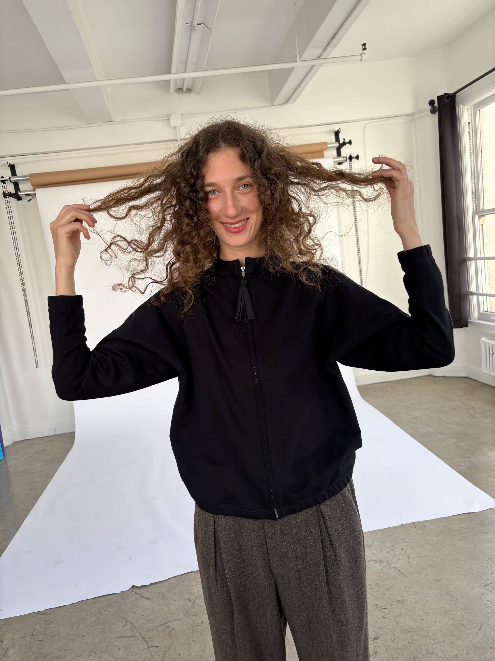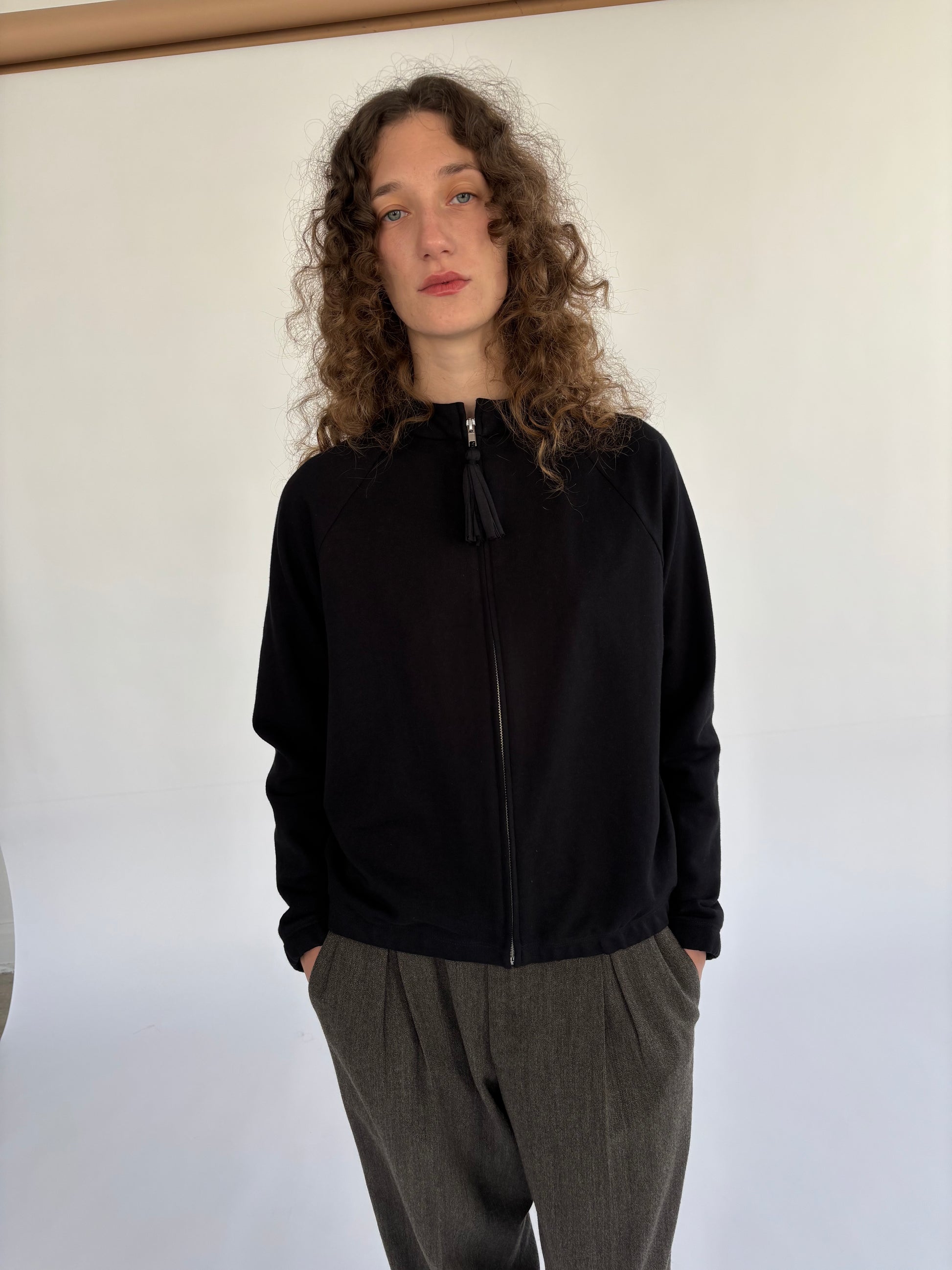 100% cotton french terry zip up jacket with handmade tassel pull. Designed, cut and sewn in Los Angeles.